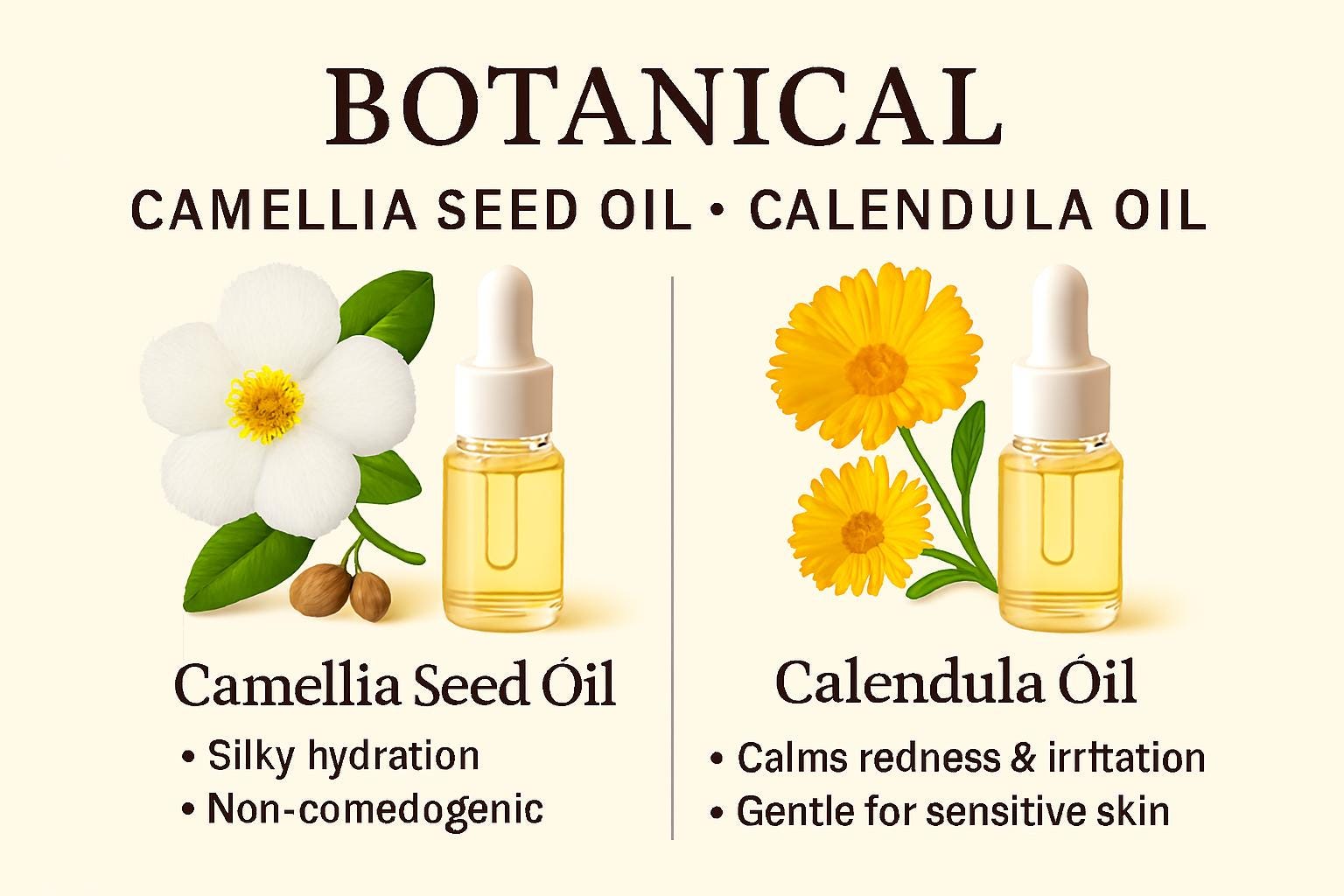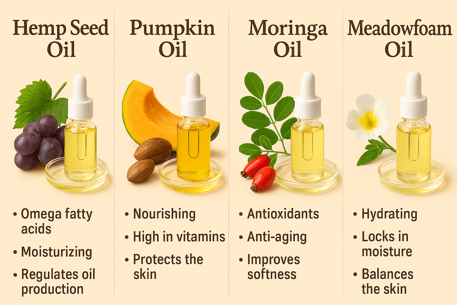 Pumpkin Seed Oil & Jojoba Oil — lightweight, nutrient-dense oils that nourish without heaviness